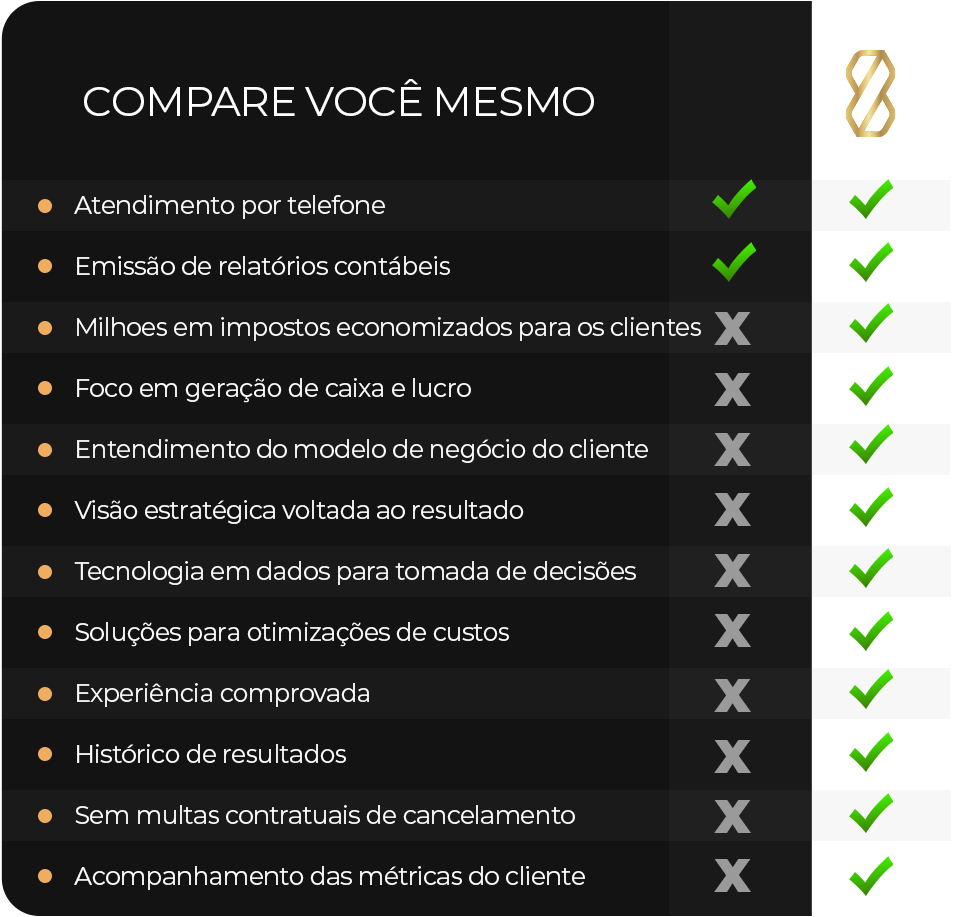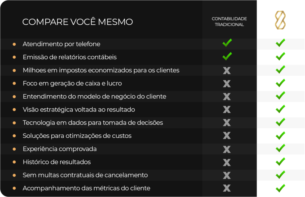 Unimos o que há de melhor para que sua empresa gere o caixa que ela precisa para prosperar e fazer a diferença: Gestão contábil, economia tributária, otimização de custos e gestão de métricas relevantes. Junte-se a nós e mude sua empresa.